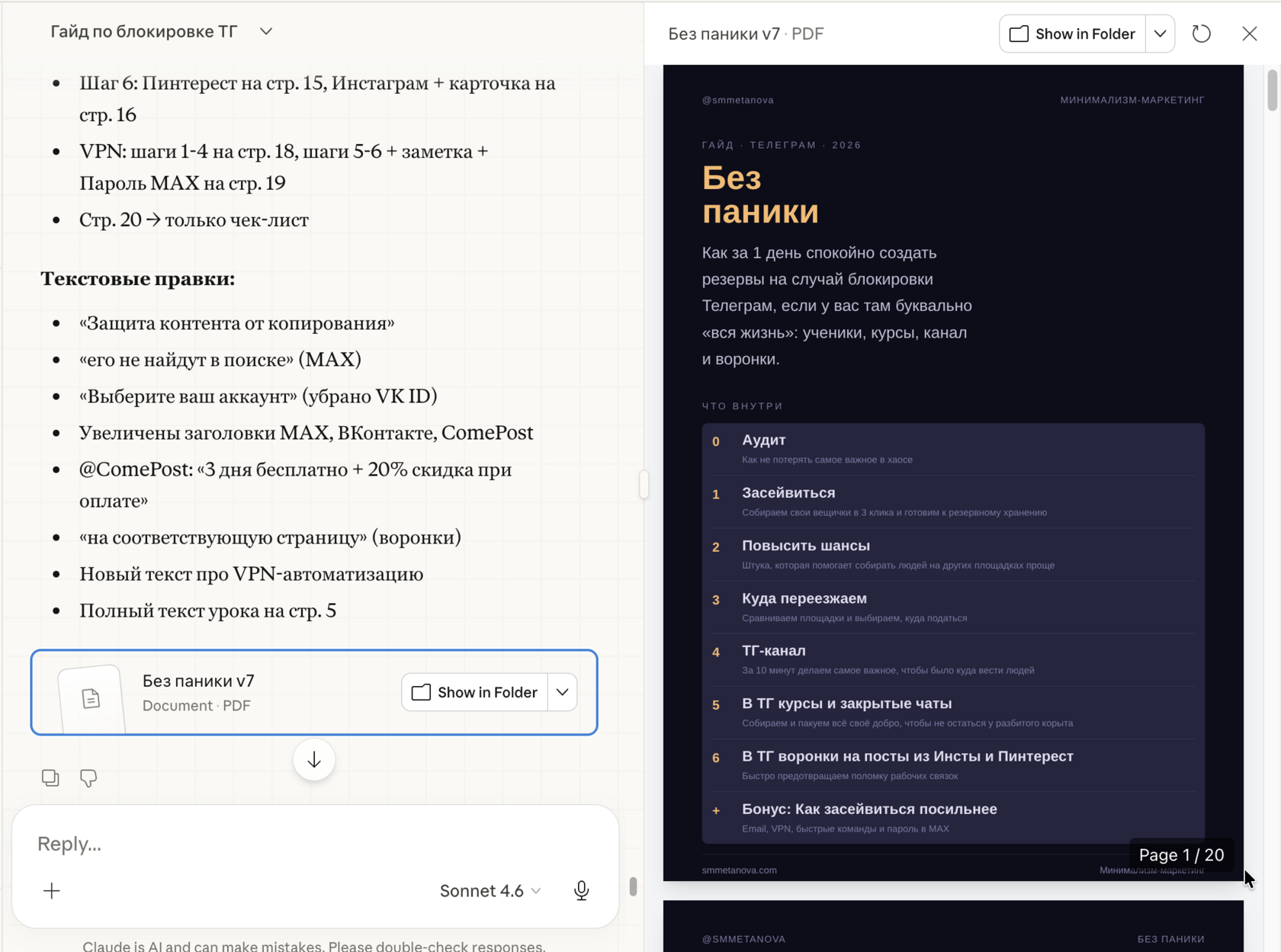 | Сделала гайд за 1 вечер и заработала на нём 20к без дизайнера с помощью ИИ | | | | Пару недель назад, когда все новости были только о блокировке телеги в рф, я решила сделать гайд "Без паники" - о том, как быстро сделать резервы на других площадках. | | | | Клёво, что у нас есть нейронка Claude, с которой можно и по структуре поштурмить, и дизайн сделать.
